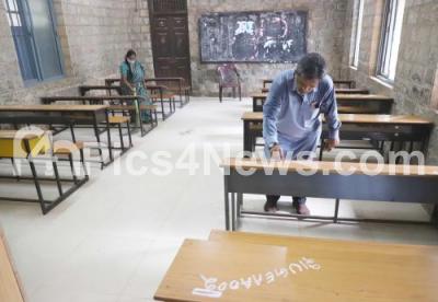 Photo Caption : School teachers and staff writing exam registration numbers on the desk at Government College, Malleshwaram ahead of CET exam, in Bengaluru on Friday 27th August 2021