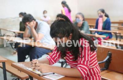 Photo Caption : Students appeared for CET exams with covid-19 precautions at Seshadripuram College, in Bengaluru on Saturday 28th August 2021