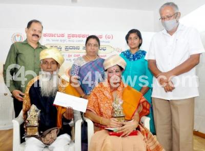 Photo Caption : Former Minister S Suresh Kumar presenting "M Gopalakrishna Adiga Book Server" Award to Sayed Esaque, Founder Kannada Library and "Nanjangud Tirumalamba Publication" Award to Journalist R Poornima during a award program presentation Karnataka Publication Association, also seen are Writer Dr. Vasundara Bhupathi, Srusti Nagesh and others, in Bengaluru on Monday 30th August 2021