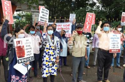 Photo Caption : Members of SUCI (C) stage a protest against union government for hike in cooking gas price, in Bengaluru on Friday 3rd September 2021