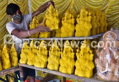 Photo Caption : Shopkeeper arranging the Ganesha idols at a market, ahead of Gowri Ganesha festival, in Bengaluru on Tuesday 7th September 2021