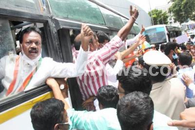 KPCC Working President and MLA Ramalinga Reddy and Congress leaders detained by police during their protest against Central government for LPG cylinder price hike, in Bengaluru on Wednesday 8th September 2021