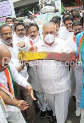 Photo Caption : KPCC Working President and MLA Ramalinga Reddy and Congress leaders protesting against Central government for LPG cylinder price hike, in Bengaluru on Wednesday 8th September 2021