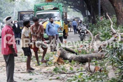Photo Caption : BBMP workers clearing the tree branches which were uprooted at Bannappa Park, KG Road, in Bengaluru on Wednesday 8th September 2021