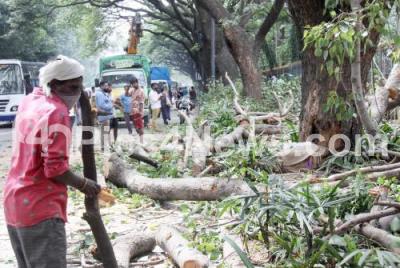 BBMP workers clearing the tree branches which were uprooted at Bannappa Park, KG Road, in Bengaluru on Wednesday 8th September 2021