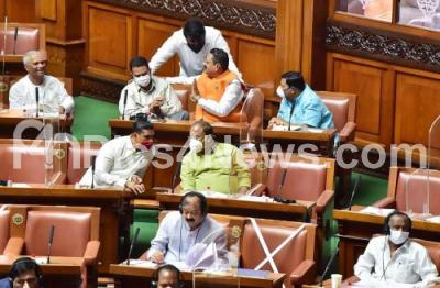 Photo Caption : Ministers Narayan Gowda, MTB Nagaraju and BJP MLAs during Assembly Session at Vidhana Soudha, in Bengaluru on Monday 13th September 2021