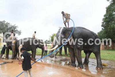 Photo Caption : Mahouts seen bathing the Dasara Elephants for the upcoming Dasara 2021 Festival in Mysuru on Thursday 16th September 2021
