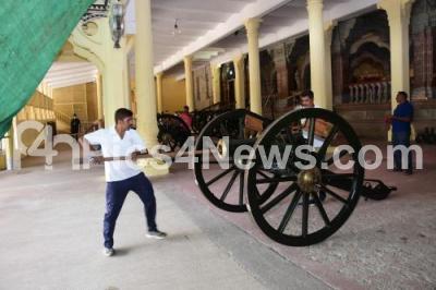 Photo Caption : Canons at Mysore Palace being cleaned as preparations are underway for Mysore Dasara celebration, in Mysuru on Tuesday 21st September 2021