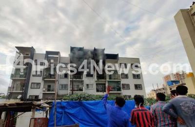 Photo Caption : An accidental fire broke out in an apartment at Devarachikkanahalli in Begur near IIMB, three fire engines were rushed to the spot to douse the flame, in Bengaluru on Tuesday 21st September 2021