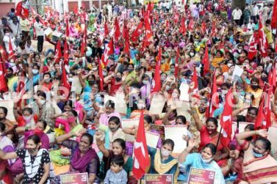Photo Caption : Members of CPI (M) protesting to fulfill their various demands , in Bengaluru on Thursday 23rd September 2021