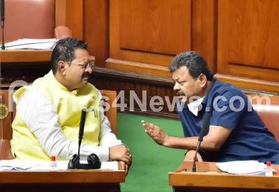 Photo Caption : BJP MLAs Basangouda Patil Yatnal and Renukacharya during Assembly Session at Vidhana Soudha, in Bengaluru on Friday 24th September 2021