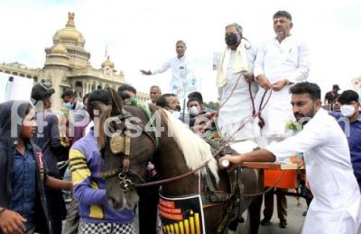 Photo Caption : CLP leader and Former CM Siddaramaiah with KPCC President DK Shivakumar and Congress MLAs, MLCs riding a horse cart to reach Vidhana Soudha for the assembly session during their protest against Central BJP government hike in Fuel and LPG price, in Bengaluru on Friday 24th September 2021