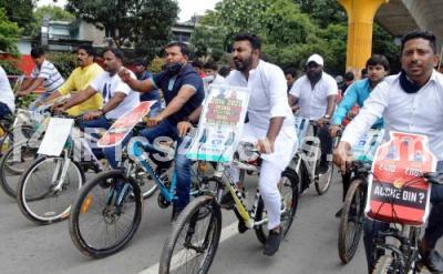 Event Description : Members of KPCC Youth Congress led by National Youth Congress President BV Srinivas participated in bicycle rally to protest against hike in Fuel and LPG price , in Bengaluru on Sunday 26th September 2021