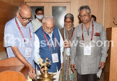 Jnanapeeta awardee Chandrashekar Kambar with Poet HS Venkateshamurthy and others during inauguration of "All India Poetry Festival" on the occasion of Azadi ka Amrit Mahotsav and Mahatma Gandhi Jayanti at Jain College, in Bengaluru on Saturday 2nd October 2021