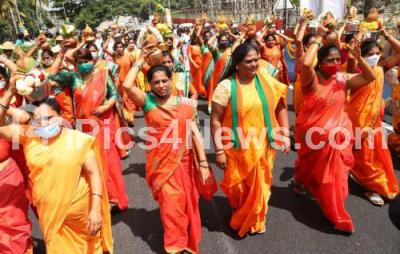 Photo Caption : Women carrying kalasa on their head during inauguration of Flyover at Shivanagar, West of Chord Road, in Bengaluru on Monday 4th October 2021