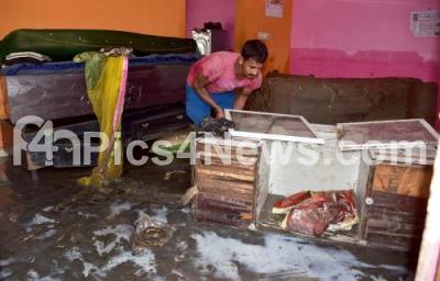 Photo Caption : Residents trying to clear the rain water logged at Rajarajeshwari Nagar, after last night heavy rainfall, in Bengaluru on Monday 4th October 2021