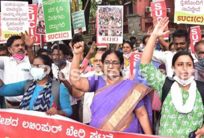 Photo Caption : Members of SUCI (C) protesting against the Uttar Pradesh Lakhimpur Kheri violence, in Bengaluru on Tuesday 5th October 2021