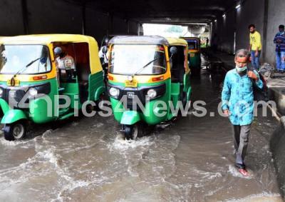 Photo Caption : People rides their vehicles through a flooded road at Okalipuram underpass, in Bengaluru on Wednesday 6th October 2021