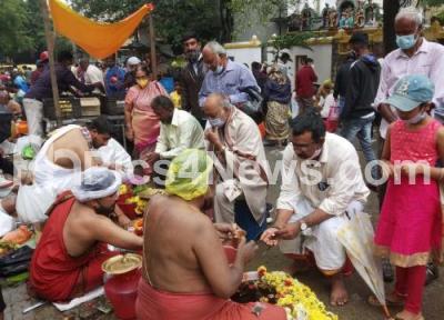Photo Caption : Priests perform rituals on the occasion of Mahalaya Amavsya at Kashi Vishweshwara Swamy temple, in Bengaluru on Wednesday 6th October 2021