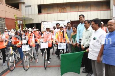 Photo Caption : Nadoja Dr. Woodey P Krishna with Pratap Lingaiah, NSS, KV Khadriya Narasimaiaha, Director, NSS Regional Directorate and others during flag off ceremony of 3 Days clean India cycle jatha at Seshadripuram College, in Bengaluru on Friday 8th October 2021