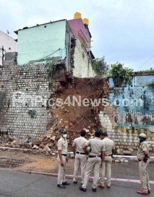 Photo Caption : A support wall collapsed at Dhanvanthri Road near Majestic Area, after heavy rains lashed Bengaluru City on Monday 11th October 2021