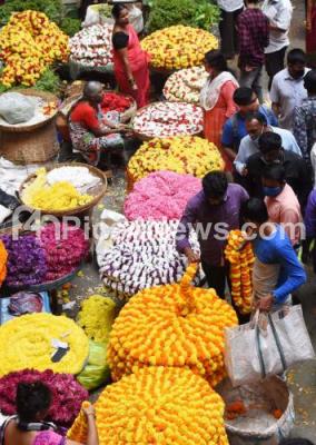 Photo Caption : People shopping flowers ahead of Ayudha Pooja during Dasara Festival at KR Market, in Bengaluru on Tuesday 12th October 2021