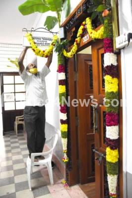 Photo Caption : Karnataka government officials decorated the offices and cars and performed pooja at Vidhana Soudha on the eve of Ayudha Pooja, in Bengaluru on Wednesday 13th October 2021