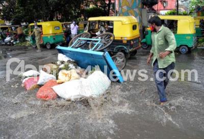 Vegetable vendor trying to pickup up the vegetable sacks fallen down in the water logged road in KR Market, as rains continue to lash Bengaluru City on Friday 15th October 2021