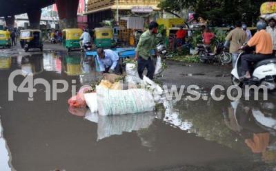 Photo Caption : Vegetable vendor trying to pickup up the vegetable sacks fallen down in the water logged road in KR Market, as rains continue to lash Bengaluru City on Friday 15th October 2021