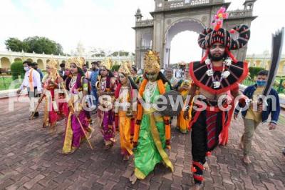 Photo Caption : Folk artistes participated in a cultural procession during Golden Howdah Jumbo Savari Annual Dasara Procession, celebrating Mysuru Dasara 2021 Festival, in Mysuru on Friday 15th October 2021