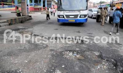 Photo Caption : Bad road conditions at Majestic Bus Stand, causing inconvenience to the buses and passengers, in Bengaluru on Tuesday 19th October 2021