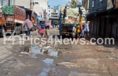 Photo Caption : Bad road condition at New Tharagupet Road, causing inconvenience to the motorists, in Bengaluru on Sunday 24th October 2021