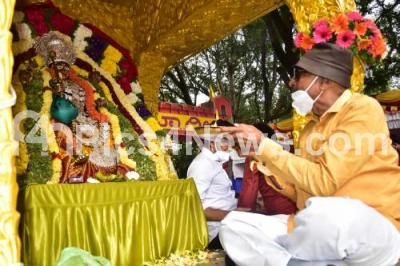 Photo Caption : Vatal Nagaraj paid tribute to Goddess Bhuvaneshwari Devi, the mother Goddess of Karnataka, during the Kannada Rajyotsava procession at SBM Circle, in Bengaluru on Monday 1st November 2021
