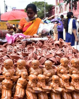 Photo Caption : A woman selling clay lamps on the eve of Diwali Festival at KR Market, in Bengaluru on Tuesday 2nd November 2021
