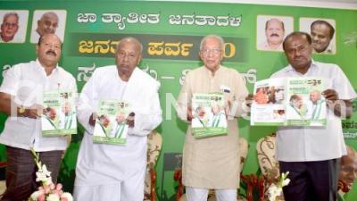 Former PM and JD(S) Supremo HD Deve Gowda, Former CM HD Kumaraswamy, Journalist C Ramaiah and JD(S) State President HK Kumaraswamy during launch of "Janata Patrika" magazine at JP Bhavan, in Bengaluru on Monday 8th November 2021