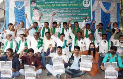 Photo Caption : Members of Karnataka Rajya Raitha Sangha and Haisuru Sene protesting and demanding the Implementation of Mekedatu drinking water project for Chikkaballapura, Kolara, Tumkuru, Bengaluru City and Ramanagara districts , in Bengaluru on Monday 15th November 2021