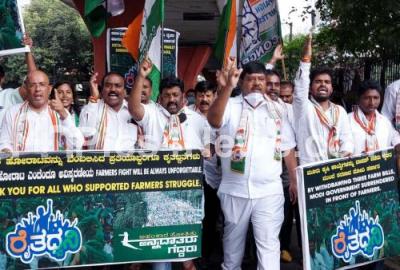 Photo Caption : Members of Bengaluru City Youth Congress participated in thanks giving rally who were supported for the farmers protest, after Prime Minister Narendra Modi announced the repealing of the three farm reform laws, in Bengaluru on Friday 19th November 2021