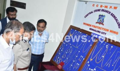 Photo Caption : Police Commissioner Kamal Pant inspects the recovered jewels which were recovered by CCB Women Protect Wing during a press conference at Commissioner office, in Bengaluru on Friday 19th November 2021