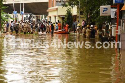 National Disaster Response Force (NDRF) during a evacuation operation of the residents of Kendriya Vihar from a flooded area due to overnight rainfall and a breach of the adjacent Yelahanka lake wall, in Bengaluru on Monday 22nd November 2021