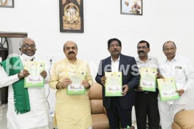 Photo Caption : Members of the Agriculture Pricing Commission today submitted a report to Chief Minister Basavaraja Bommai on the analysis of the area of agriculture and horticultural crops, yield, production, cost of production and market price as well as price dispersal analysis between farmers and consumers, also seen are Chief Ministers Secretary Agriculture Department Director Srinivas and former MLA Pratap Gowda Patil, in Bengaluru on Tuesday 23rd November 2021