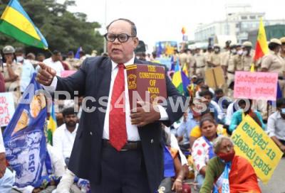 Photo Caption : A man dressed as Dr BR Ambedkar along with members of Samvidhana Samrakshana Aikyatha Samithi participates in a rally to commemorate Samvidhan Divas (Constitution Day), in Bengaluru on Friday 26th November 2021