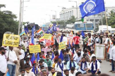 Photo Caption : Members of Samvidhana Samrakshana Aikyatha Samithi participate in a rally to commemorate Samvidhan Divas (Constitution Day), in Bengaluru on Friday 26th November 2021