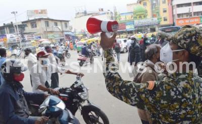 Photo Caption : BBMP Marshals use speakers to educate people to wear masks and to follow the covid-19 precautions and norms at KR Market, in Bengaluru on Sunday 28th November 2021