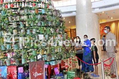 Photo Caption : Unique Christmas tree (made by plants, dolls and gift items) displayed at a private hotel at MG Road for the upcoming Christmas festival, in Bengaluru on Thursday 2nd December 2021