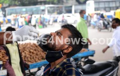 Health workers collect swab samples for COVID 19 tests at KR Market , amid ongoing Coronavirus pandemic, in Bengaluru on Thursday 2nd December 2021