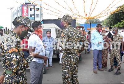 Photo Caption : BBMP Marshals impose fine on public at KR Market, who were found not wearing masks amid Coronavirus pandemic, in Bengaluru on Tuesday 7th December 2021