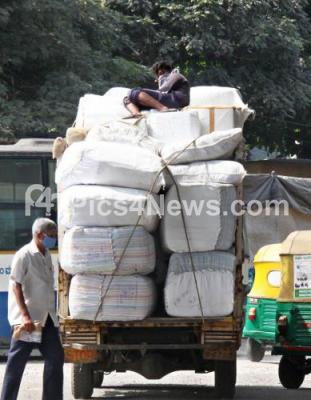 Photo Caption : A goods carrier vehicle overloaded at KR Market, in Bengaluru on Tuesday 7th December 2021