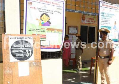 Photo Caption : Police security at Sulikere Gram Panchayath Election center during MLC election, in Bengaluru on Friday 10th December 2021
