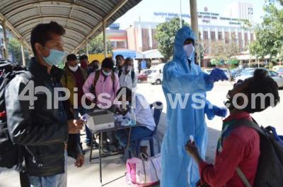 Photo Caption : Health workers collect swab samples for COVID 19 tests at City Railway station, after Omicron Coronavirus variants were found, in Bengaluru on Friday 10th December 2021