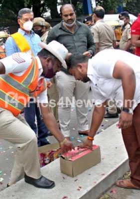Photo Caption : Police personnel seized crackers during MLC elections results at Maharani College, in Bengaluru on Tuesday 14th December 2021